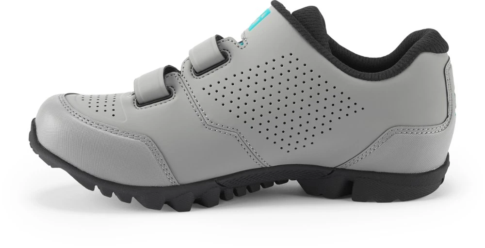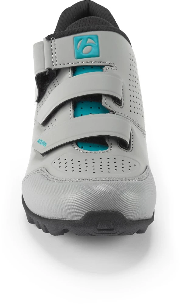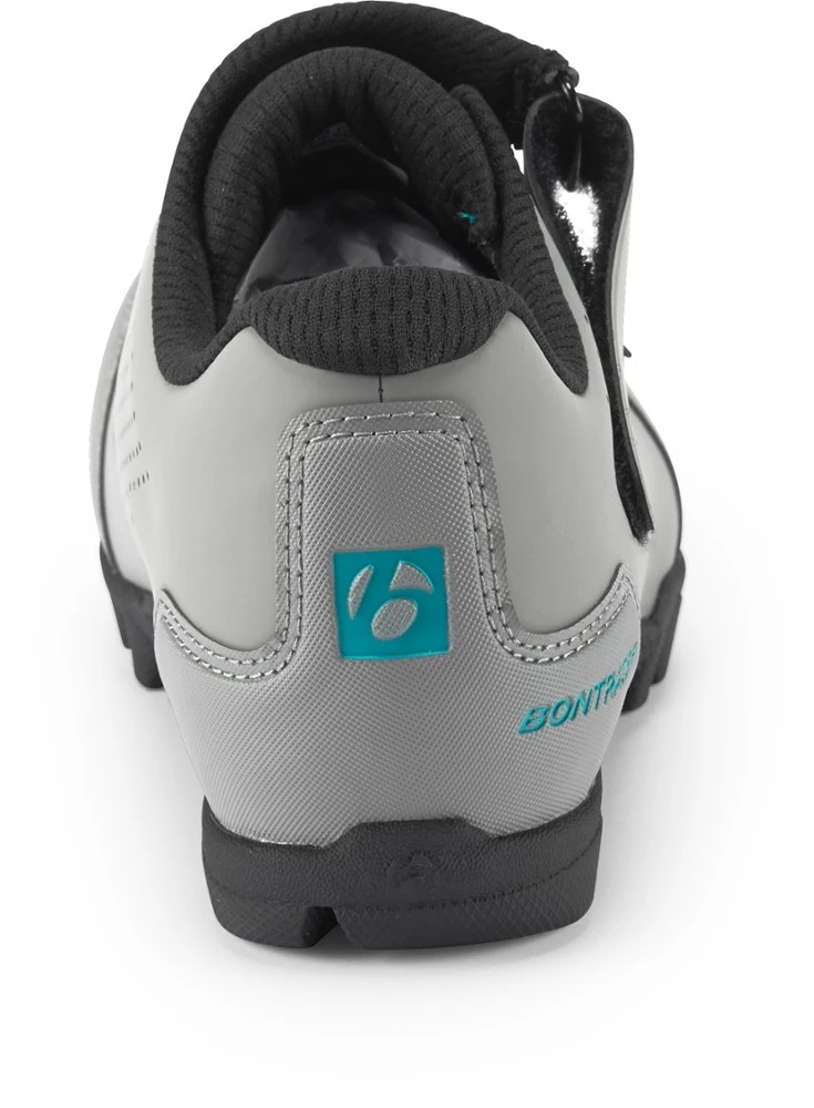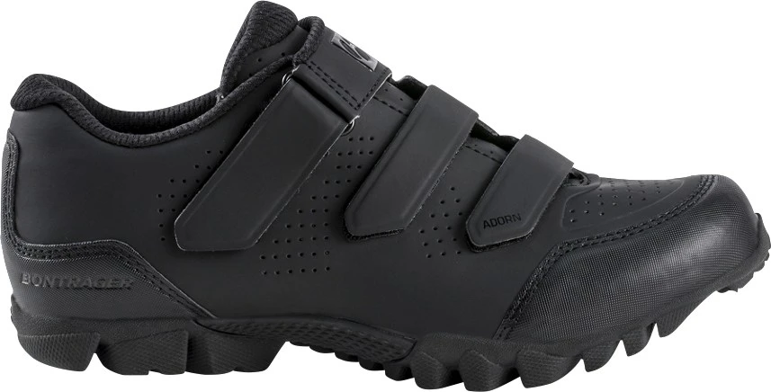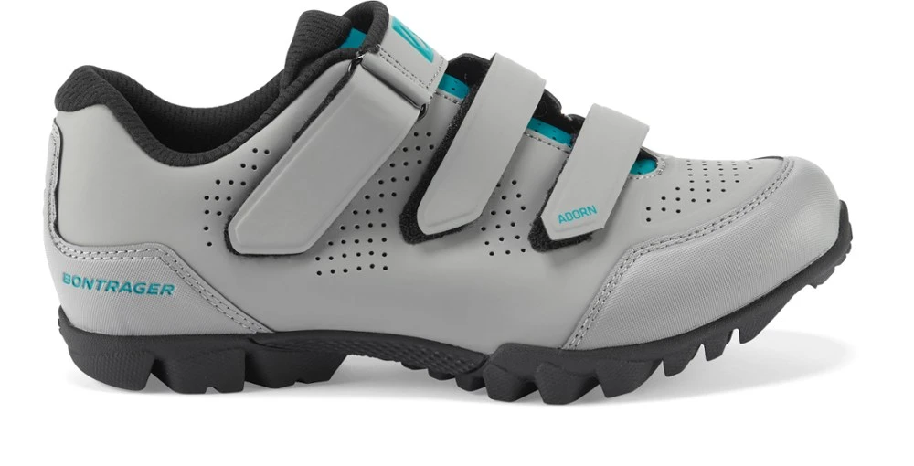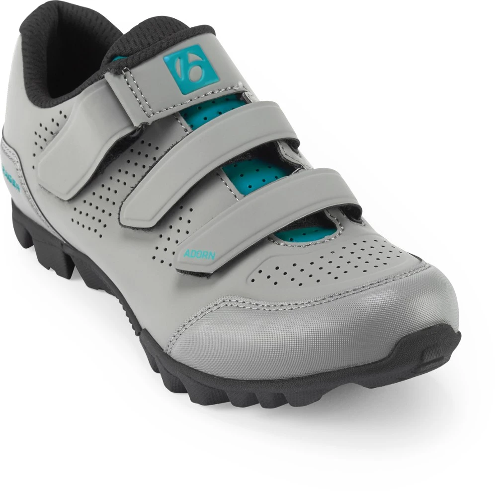 The all-around women’s Bontrager Adorn mountain bike shoes have grippy rubber soles to deliver off-bike confidence while the durable reinforcement of GnarGuard offers protection against trail debris.